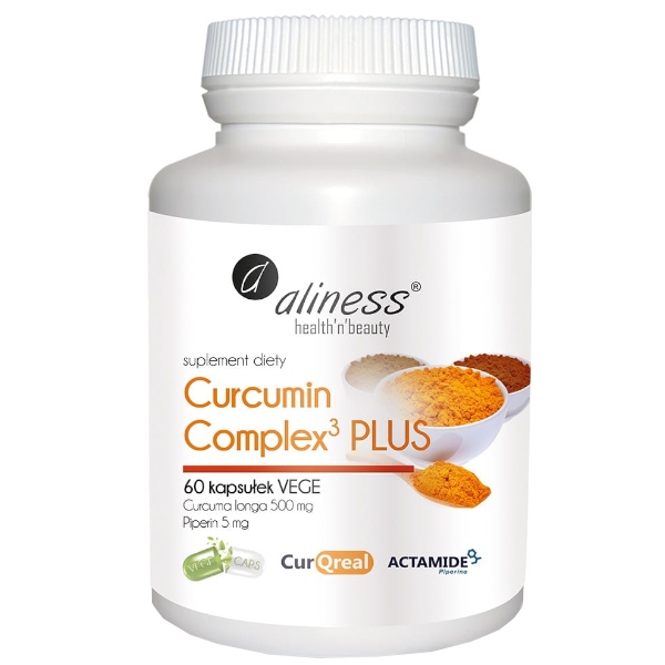 Kompleks kurkuminy Aliness 3 PLUS to kompozycja 100% naturalnych kurkuminoidów, w postaci opatentowanej CurQreal ekstrakt z kurkumy. Kompleks składa się z trzech związków chemicznych naturalnie występujących w kurkumie: kurkuminy, desmetoksykurkuminy (DMC) i bis-desmetoksykurkumina (BDMC). Aby zwiększyć biodostępność kurkuminoidów, skład został wzbogacony o naturalne ACTAMID ekstrakt z pieprzu, który zawiera 95% piperyny i jest otrzymywany wyłącznie z ekstrakcji wodnej.