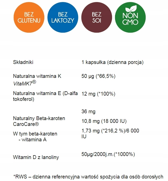 Naturalna witamina K VitaMk7 (VitaMK7® menachinon-7), naturalna witamina E (D-alfa tokoferol), Naturlany Betakaroten (CaroCare®), witamina D z lanoliny (cholekalcyferol), składniki otoczki: żelatyna, glicerol (substancja wiążąca), olej słonecznikowy (substancja wypełniająca), woda.