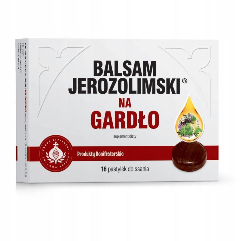 Balsam Jerozolimski® na gardło suplement diety stworzony w trosce o prawidłowe funkcjonowanie gardła, w oparciu o 400 lat doświadczenia Zakonu Bonifratrów. Zawiera Extractum Compositum Balsam Jerozolimski – ekstrakt z ziół według zakonnej receptury.
