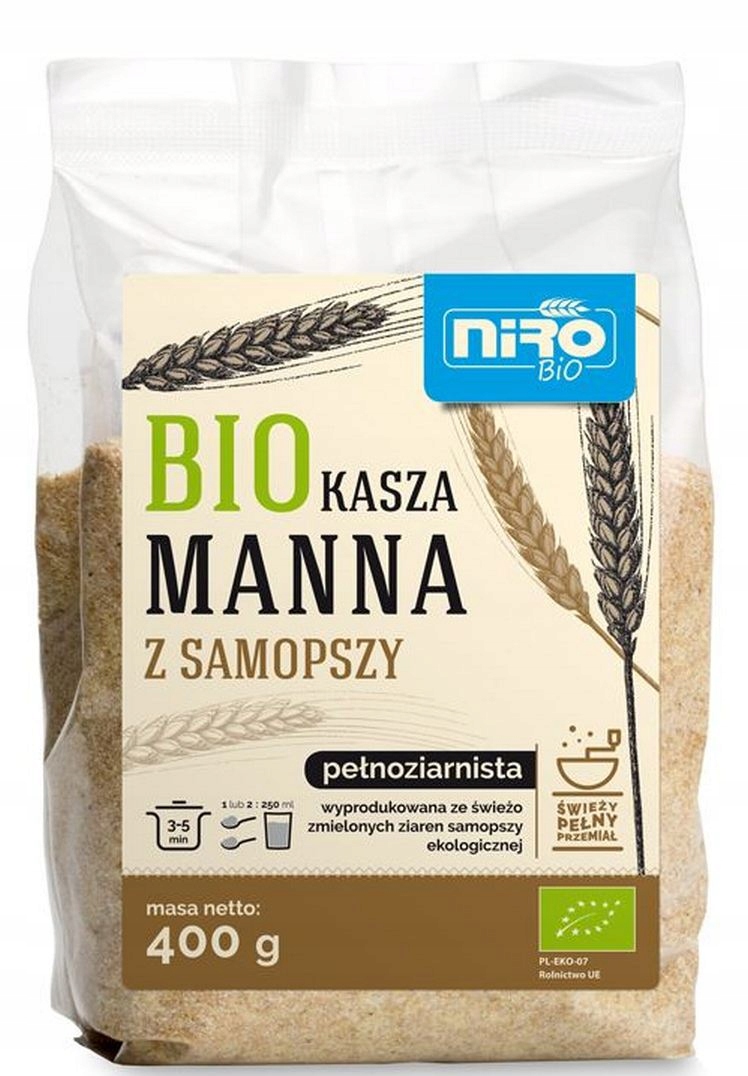 Pełnoziarnista kasza manna z pszenicy samopszy* (100%) (*certyfikowany składnik ekologiczny)