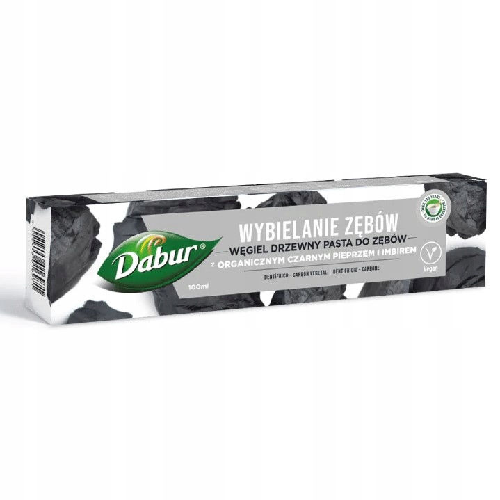 Pasta do zębów Dabur z węglem, czarnym pieprzem i imbirem wykorzystuje moc wybielania węgla, aby usunąć przebarwienia, pozostawiając olśniewająco biały uśmiech.