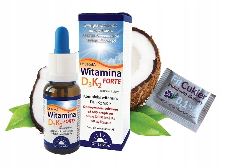 Wysokiej jakości witaminy D3 i K2 (menachinon-7, MK-7, MenaQ-7) rozpuszczone w hipoalergicznym oleju MCT z kokosa.