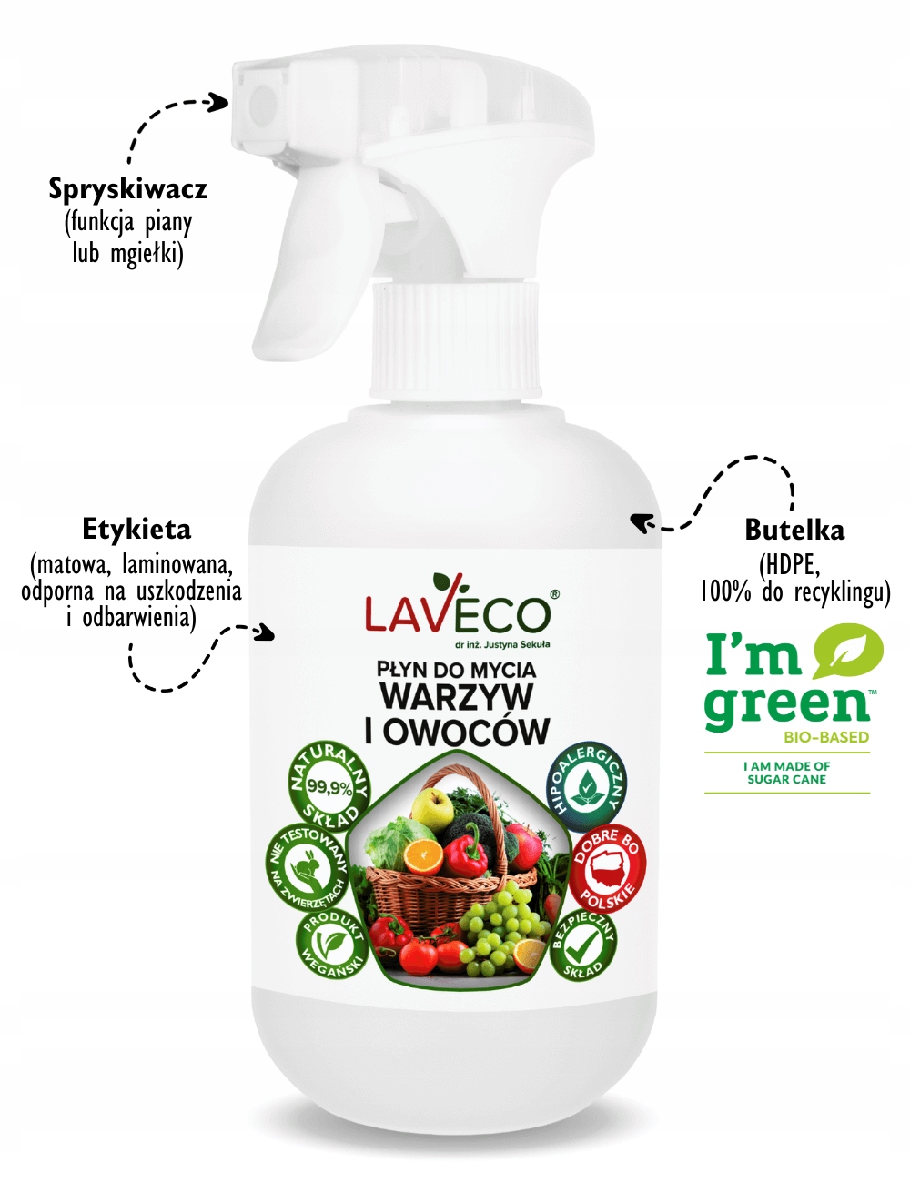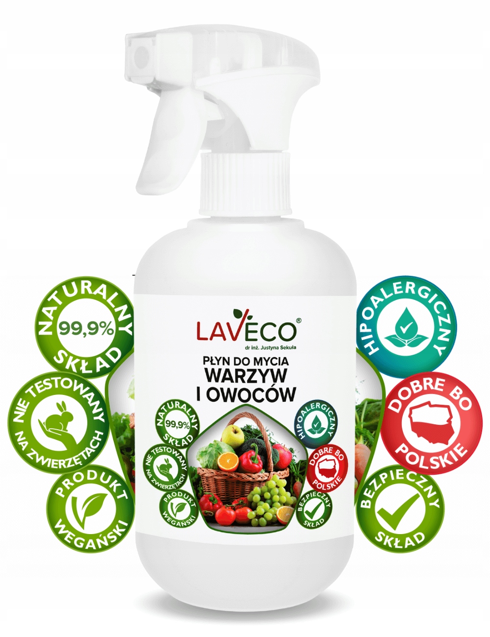 Płyn do mycia owoców i warzyw, który skutecznie usuwa biologiczne i chemiczne zanieczyszczenia z powierzchni skórki takie jak: wosk, pestycydy, bakterie, wirusy, brud. Produkt wyróżniający w 100% naturalny skład surfaktantów, starannie dobranych o wysokiej skuteczności. Opakowanie do wielokrotnego użytku.