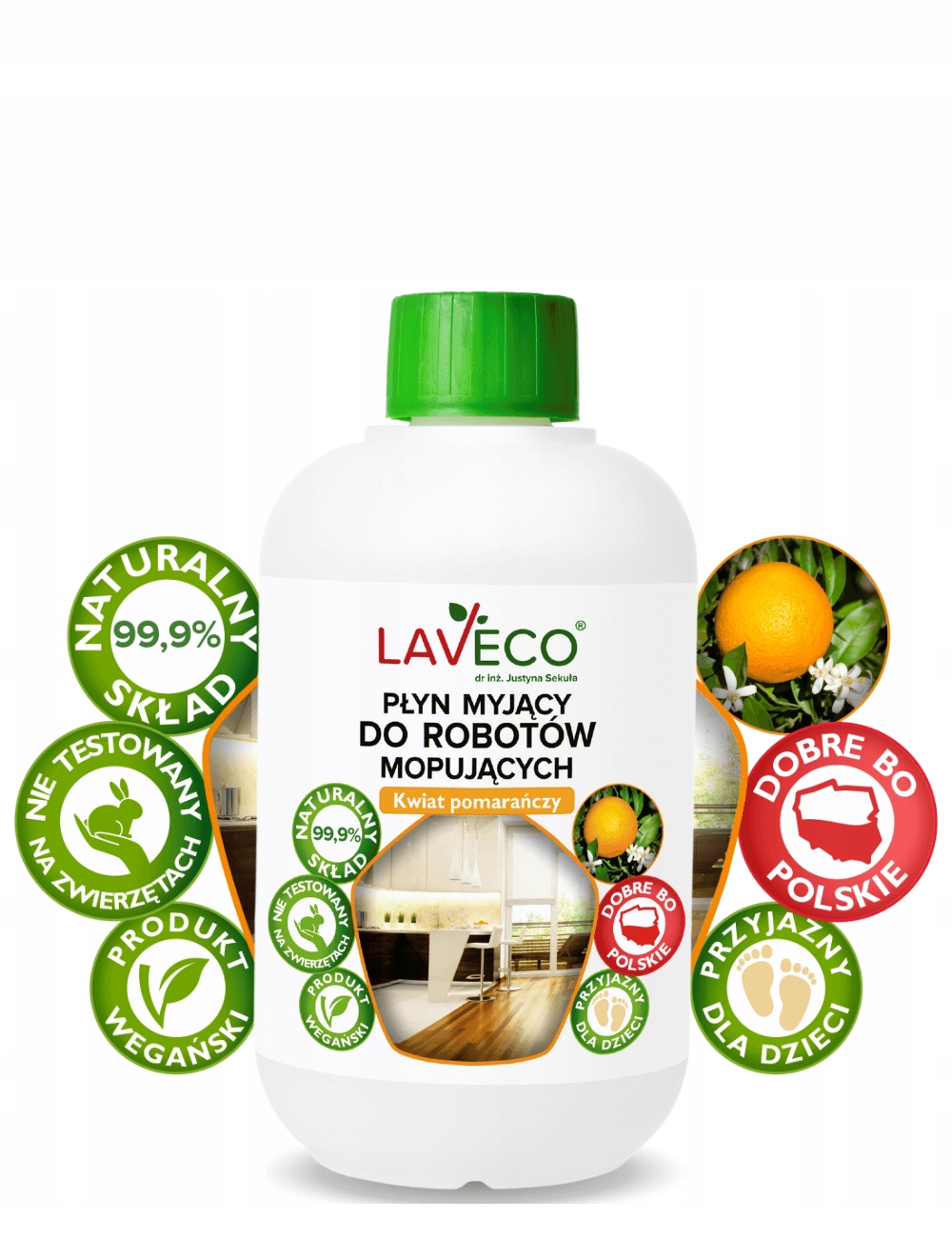Nowej generacji płyn do mycia podłóg dedykowany do robotów mopujących i odkurzaczy myjących o zapachu Kwiatu pomarańczy. Zadbaj o zdrowie swojej rodziny!