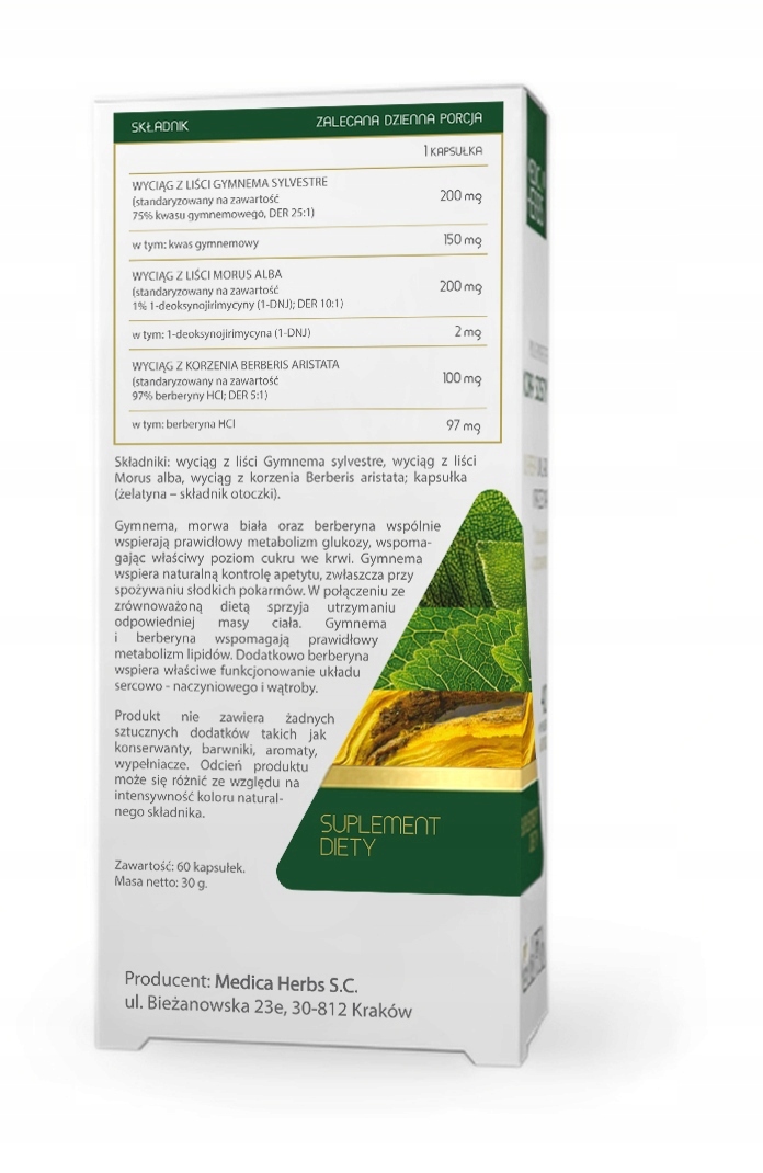 Składniki: wyciąg z liści Gymnema sylvestre, wyciąg z liści Morus alba, wyciąg z korzenia Berberis aristata; kapsułka (żelatyna – składnik otoczki).