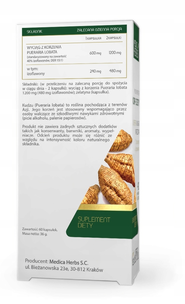 Składniki: wyciąg z korzenia Pueraria lobata; kapsułka (żelatyna – składnik otoczki).