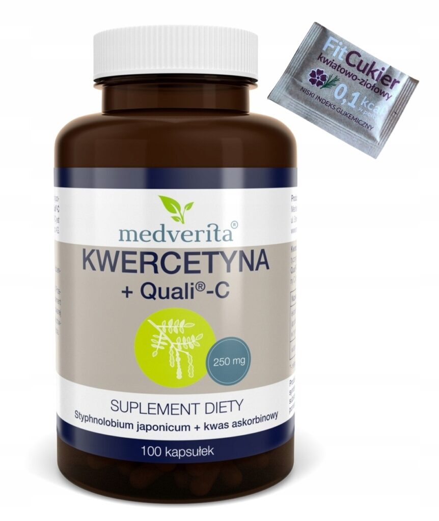 Składniki: ekstrakt z perełkowca japońskiego (Styphnolobium japonicum) standaryzowany na 98% kwercetyny, witamina C Quali®–C (Kwas L-askorbinowy), żelatyna (otoczka kapsułki).