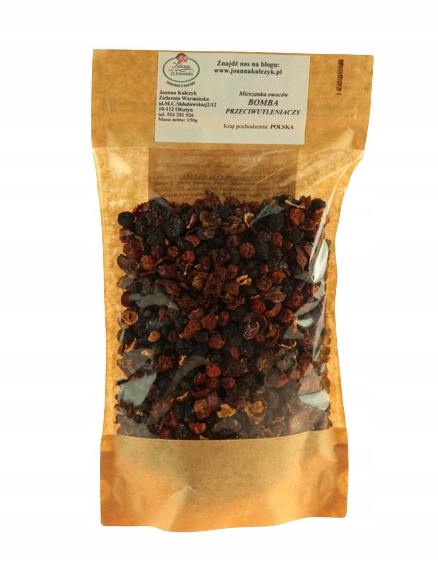 Bomba przeciwutleniaczy to mieszanka owoców o właściwościach antyoksydacyjnych. Dzika róża i bez czarny wspomagają zdrowie układu oddechowego, odporność i oczyszczanie organizmu. Czarna porzeczka, dzika róża i aronia wpływają na zdrowie układu krążenia. Głóg wspiera prawidłową pracę serca. Jarzębina i dzika róża wzmacniają organizm.