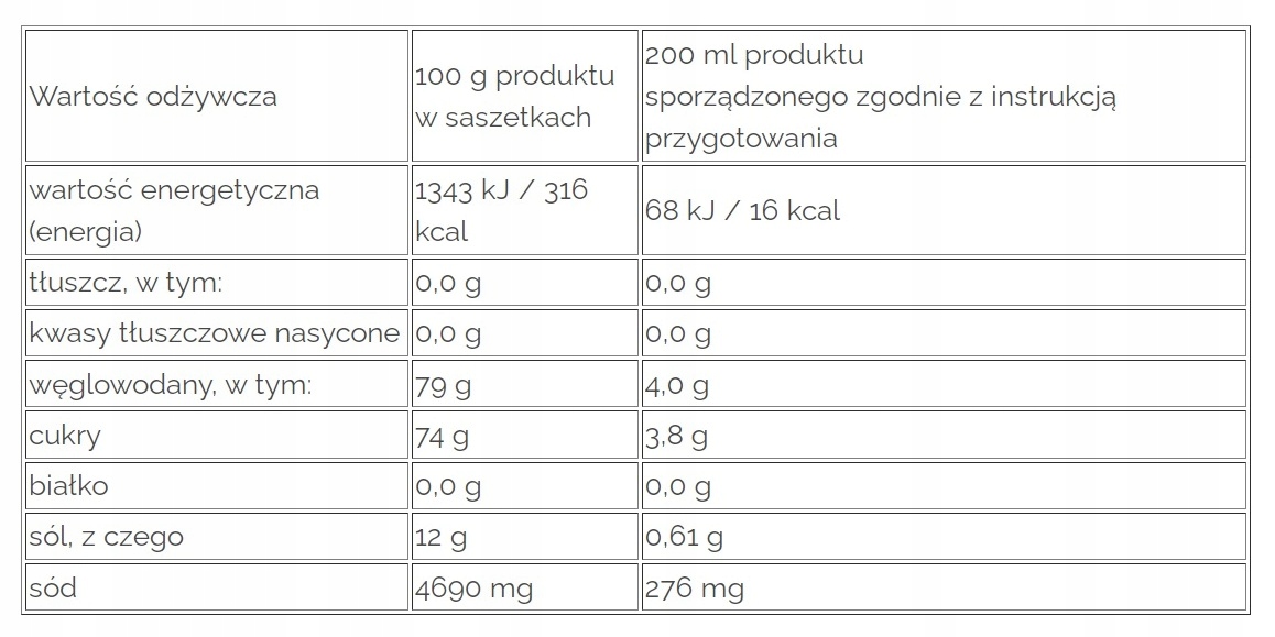 • Tłuszcz 0 g/0 g w tym kwasy tłuszczowe nasycone 0 g/0 g