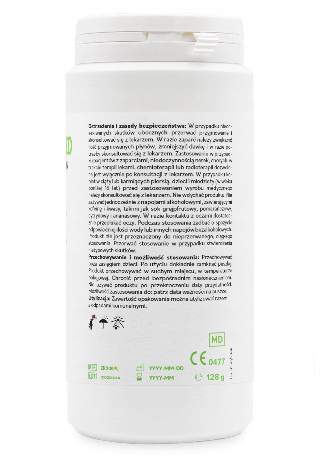 W przypadku nieoczekiwanych skutków ubocznych przerwać przyjmowanie i skonsultować się z lekarzem. W razie zaparć należy zwiększyć ilość przyjmowanych płynów, zmniejszyć dawkę i w razie potrzeby skonsultować się z lekarzem. Zastosowanie w przypadku pacjentów z zaparciami, niedoczynnością nerek, chorych, w trakcie terapii lekami, chemioterapii lub radioterapii dozwolone jest wyłącznie po konsultacji z lekarzem. W przypadku kobiet w ciąży lub karmiących piersią, dzieci i młodzieży (w wieku poniżej 18 lat) przed zastosowaniem wyrobu medycznego należy skonsultować się z lekarzem. Nie wdychać produktu. Nie zażywać jednocześnie z napojami alkoholowymi, zawierającymi kofeinę i kwasy, takimi jak sok grejpfrutowy, pomarańczowy, cytrynowy i ananasowy. W razie kontaktu z oczami dostatecznie przepłukać oczy. Podczas stosowania zadbać o spożycie odpowiedniej ilości wody lub innych napojów bezalkoholowych. Produkt nie jest przeznaczony do nieprzerwanego, ciągłego stosowania. Przerwać stosowanie w przypadku stwierdzenia nie-