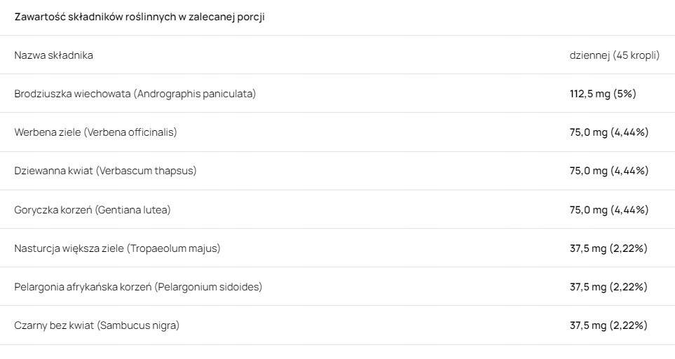 Ekstrakty wodne z ziół: Brodziuszka wiechowata (Andrographis paniculata), Werbena ziele (Verbena officinalis), Dziewanna kwiat (Verbascum thapsus), Goryczka korzeń (Gentiana lutea), Nasturcja większa ziele (Tropaeolum majus), Pelargonia afrykańska korzeń (Pelargonium sidoides), Czarny bez kwiat (Sambucus nigra), gliceryna spożywcza (E422), glikol propylenowy (E1520), kwas jabłkowy (E296), cytrynian sodu (E 331), witamina C (E330), witamina E (d-alfa-tokoferol) (E 307),