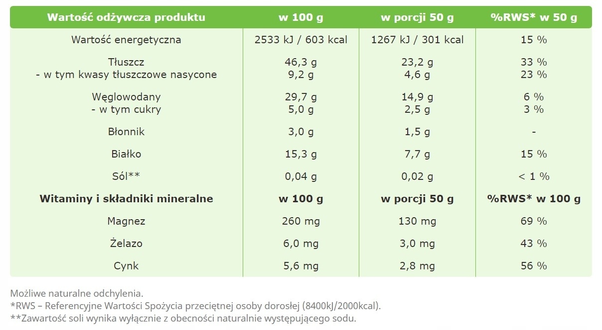 Wartość odżywcza w 100 g/ w porcji 0,5 g: