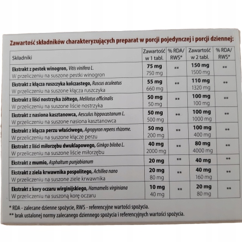 Składniki: substancje wypełniające (celuloza mikrokrystaliczna, sól sodowa karboksymetylocelulozy usieciowiona), ekstrakt z pestek winogron – 10% proantocyjanidów (Vitis vinifera L.), ekstrakt z kłącza ruszczyka kolczastego – 5% ruskogenin (Ruscus aculeatus), ekstrakt z liści nostrzyka żółtego – 2% kumaryny (Melilotus officinalis), ekstrakt z nasion kasztanowca – 20% escyny (Aesculus hippocastanum L.), ekstrakt z kłącza perzu właściwego (Agropyron repens rhizome), ekstrakt z liści miłorzębu dwuklapowego (Ginkgo biloba L.) 22–27% glikozydów flawonolowych, 2,6–3,3% bilobalidów, 2,8–3,4% ginkoloidów, ekstrakt z mumio (Asphaltum punjabianum), ekstrakt z krwawnika pospolitego (Achillea nano), substancje przeciwzbrylające (sole magnezowe kwasów tłuszczowych, kwasy tłuszczowe – kwas stearynowy, dwutlenek krzemu), substancje glazurujące (hydroksypropylometyloceluloza, glikol polietylenowy), ekstrakt z kory oczaru wirginijskiego (Hamamelis virginiana).