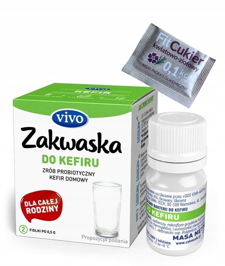 OPIS: Kefir to  znany od wielu wieków fermentowany napój mleczny wywodzący się z Kaukazu. Zakwaska do KEFIRU VIVO zawiera mikroflorę ziarna kefiru, żywe kultury bakterii, w tym pałeczki kwasu mlekowego, bifidobakterie i cenne drożdże kefirowe. Kefir otrzymany z Zakwaski może stanowić świetny element zbilansowanej i zróżnicowanej diety. Spożywany np. z otrębami sprawia, że głód znika na długi czas. Dzięki domowemu przygotowaniu otrzymujemy kefir wyłącznie z naturalnie występującymi cukrami. Domowy kefir ma wspaniały, orzeźwiający smak. Najlepszy wychodzi z mleka 2% procentowego.